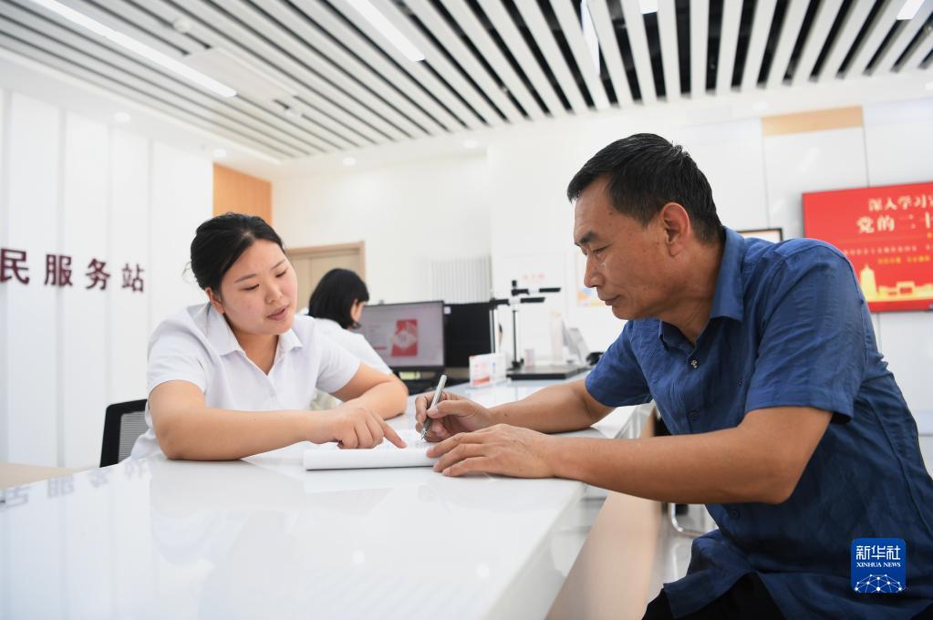 河北雄安新區容東片區南文營社區居民(右)在社區便民服務站辦理業務(5月23日攝)。