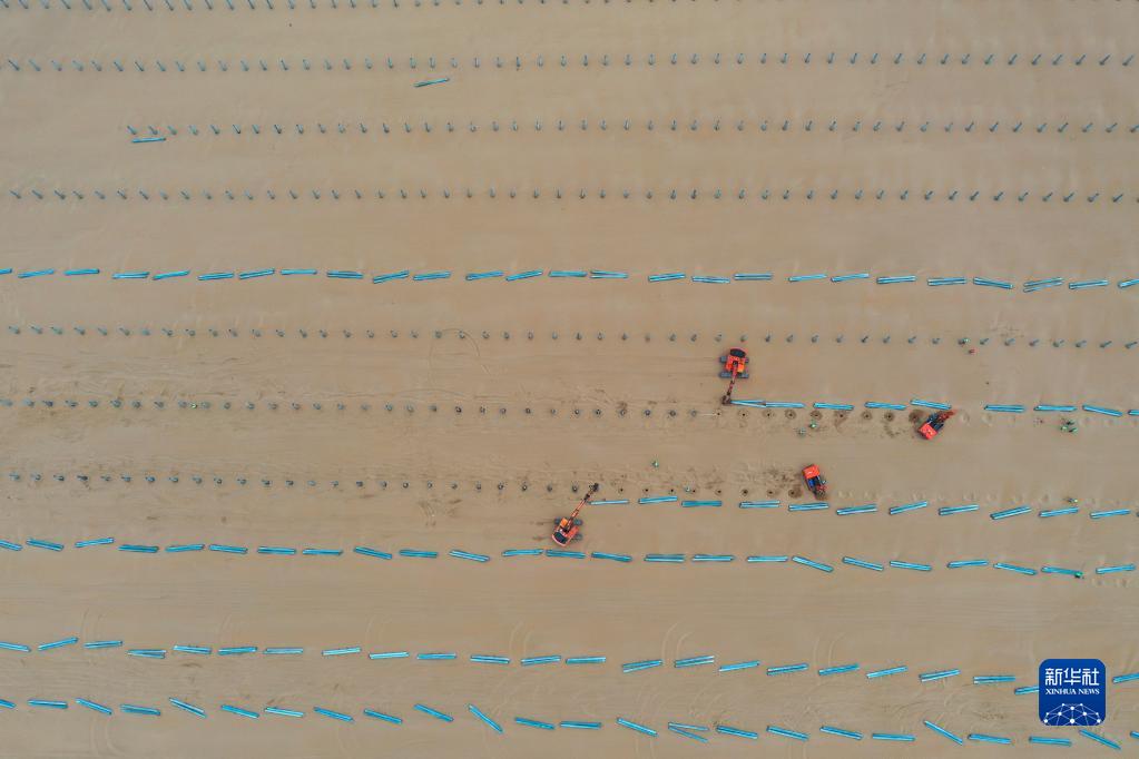 5月24日,機械工程車輛在達拉特旗庫布其沙漠中施工(無人機照片)。