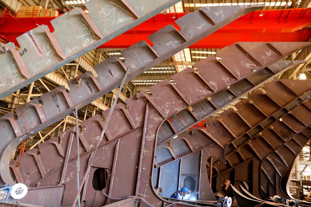 5月23日,位于青島市即墨田橫島省級旅游度假區的青島造船廠,工人在進行船體制造。