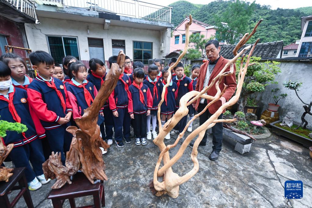 5月24日,煤山鎮新民村非遺傳承人佘廣坤(右一)在給長興縣煤山鎮中心小學的學生介紹根雕藝術。