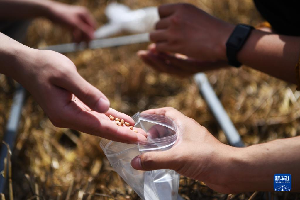 5月24日,在河南省南陽市唐河縣的活動現場,工作人員在選定的采樣區域撿拾掉落的麥粒。
