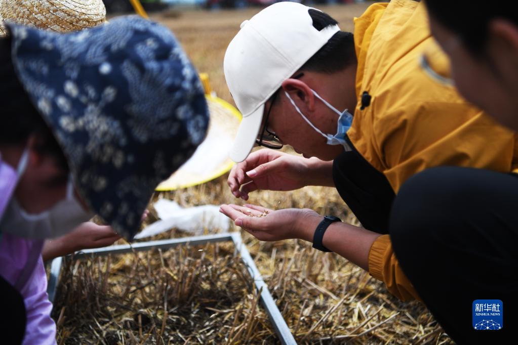 5月24日,在河南省南陽市唐河縣的活動現場,工作人員在選定的采樣區域撿拾掉落的麥粒。