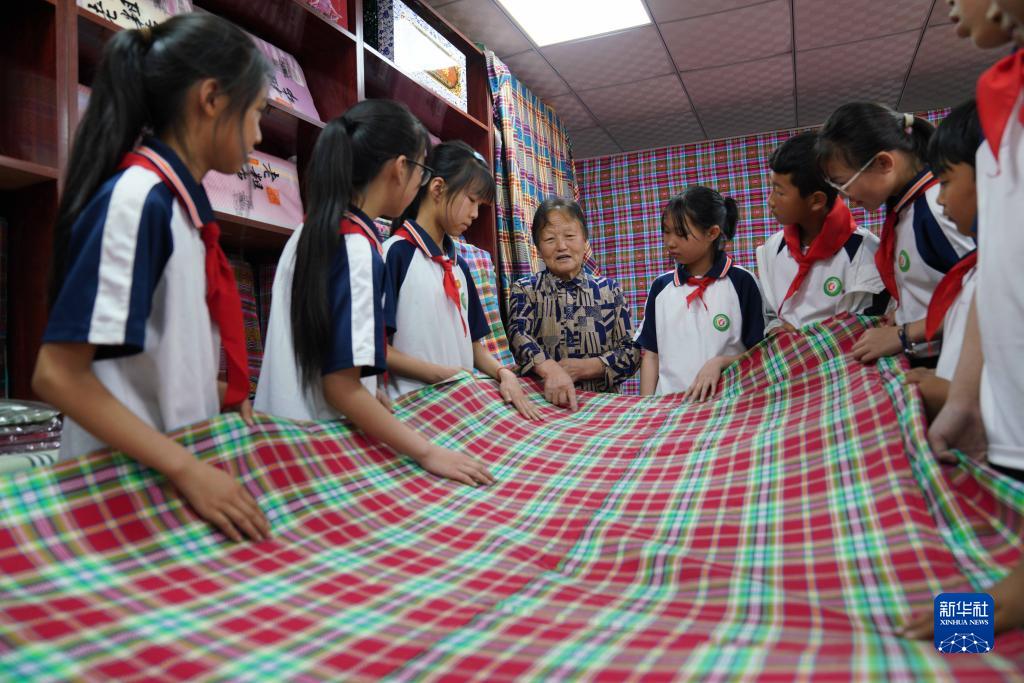 5月24日,民間藝人在河北省沙河市塔子峪村非遺傳習所內為小學生講解四匹繒布制作技藝。