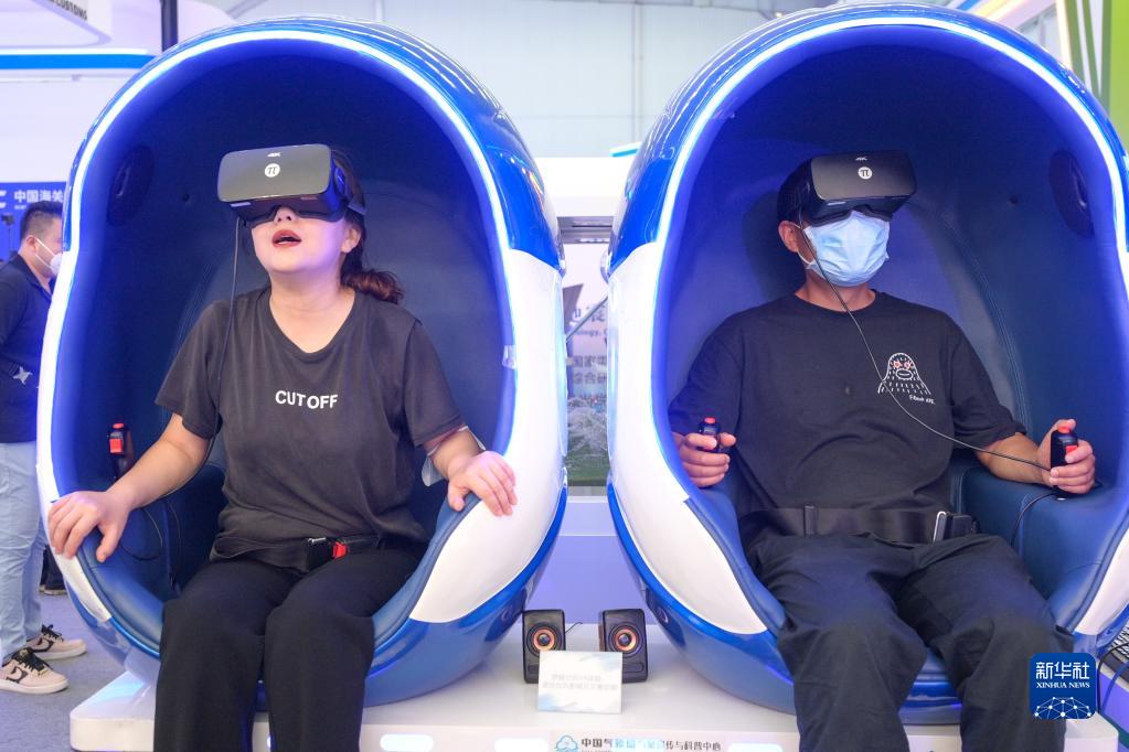 5月24日,參觀者在2023年全國科技活動周暨北京科技周活動現場進行穿越臺風VR模擬體驗。