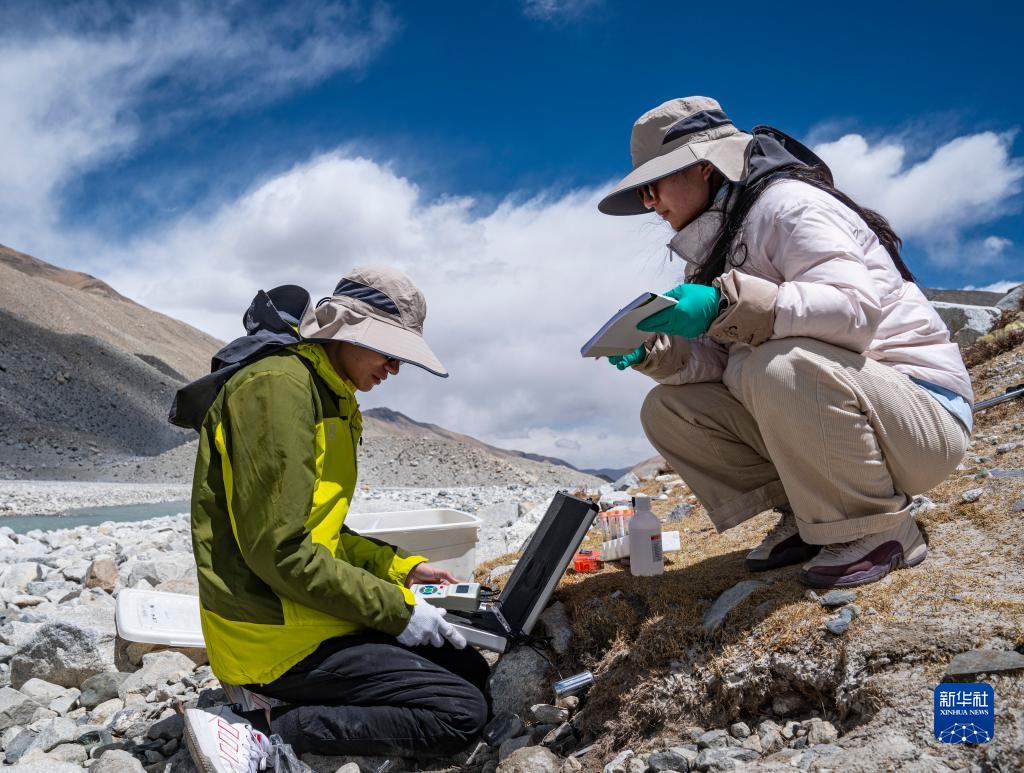 在珠峰登山大本營附近,來自西藏大學生態環境學院的科考隊員在測量土壤溫度(5月22日攝)。