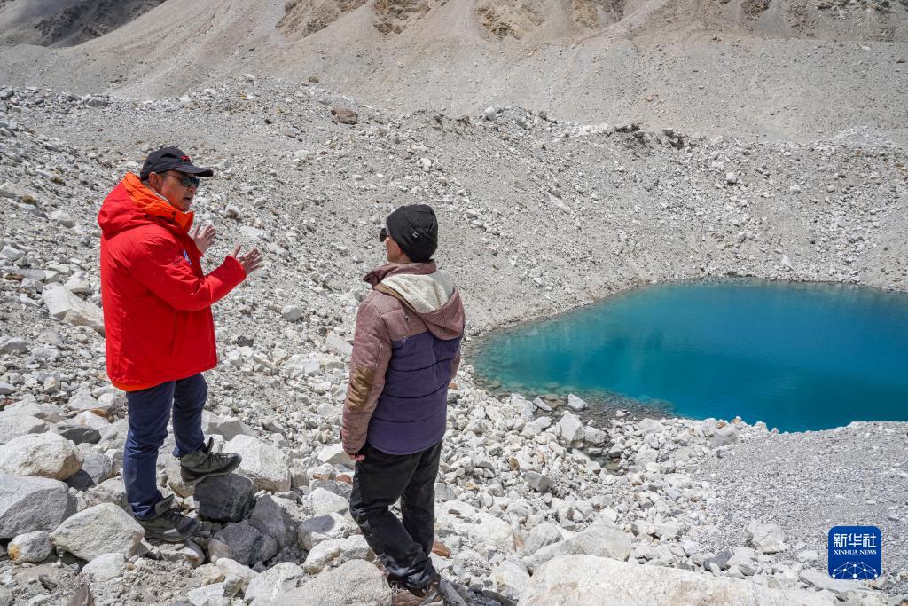 在珠峰海拔約5300米處,中國科學院西北生態環境資源研究院副院長康世昌(左)和科考隊員討論冰面湖的形成原因(5月14日攝)。
