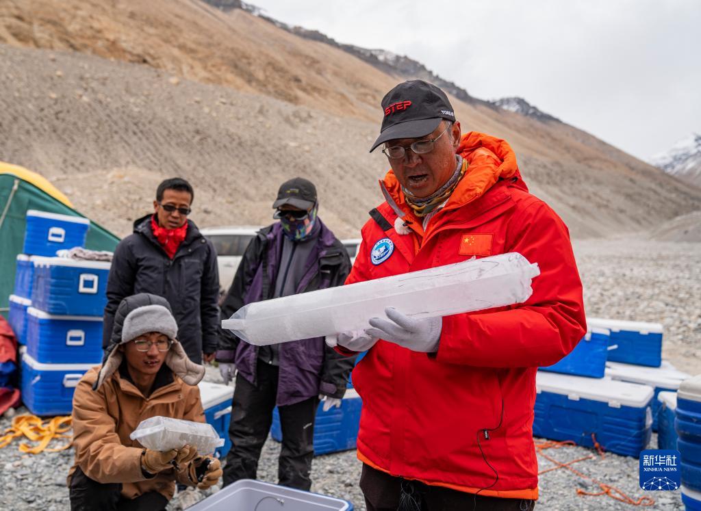 在珠峰登山大本營,中國科學院西北生態環境資源研究院副院長康世昌(右)在查看從珠峰海拔約6500米處鉆取的冰芯樣品(5月22日攝)。