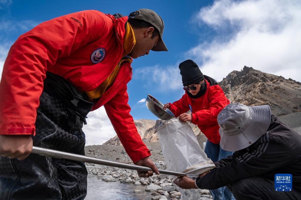 在珠峰登山大本營附近,來自西藏大學生態環境學院的科考隊員在采集水生生物樣本(5月22日攝)。