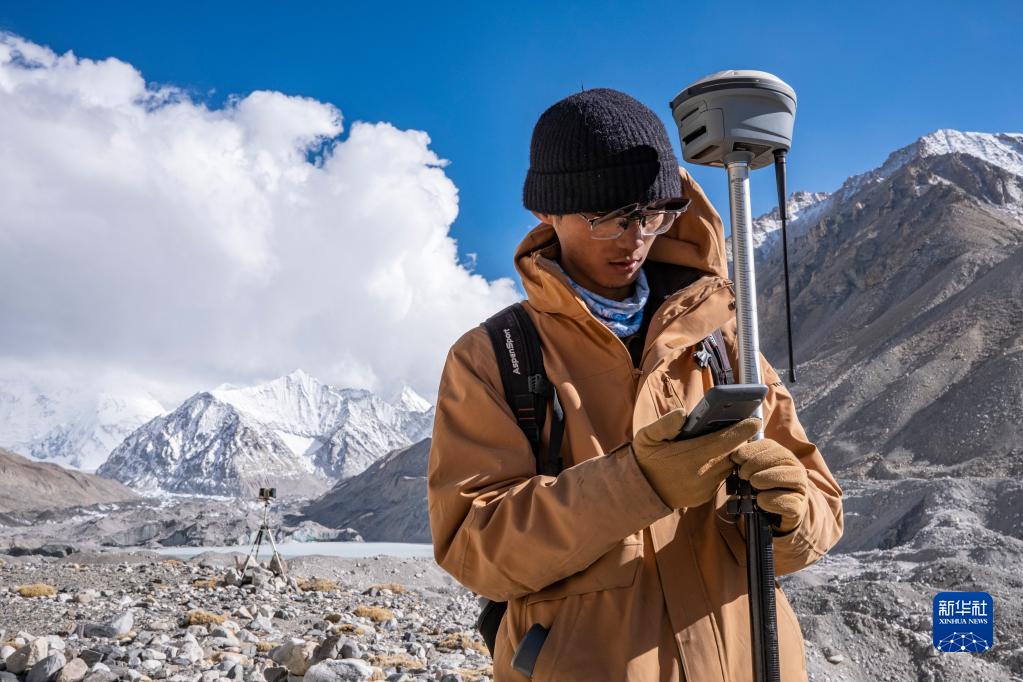 在珠峰海拔約5300米處,來自中國科學院西北生態環境資源研究院的科考隊員薛雨昂在對冰川進行實時差分GPS定位(5月15日攝)。