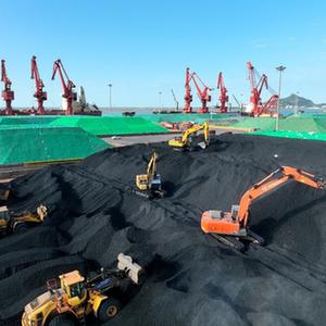 5月24日,大型機械在江蘇省連云港港煤炭碼頭堆放儲存剛從貨輪卸運的電煤(無人機照片)。