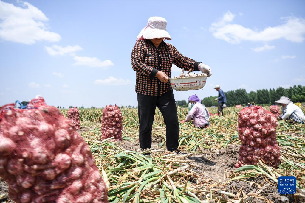 5月24日,中牟縣雁鳴湖鎮村民在田間采收大蒜。