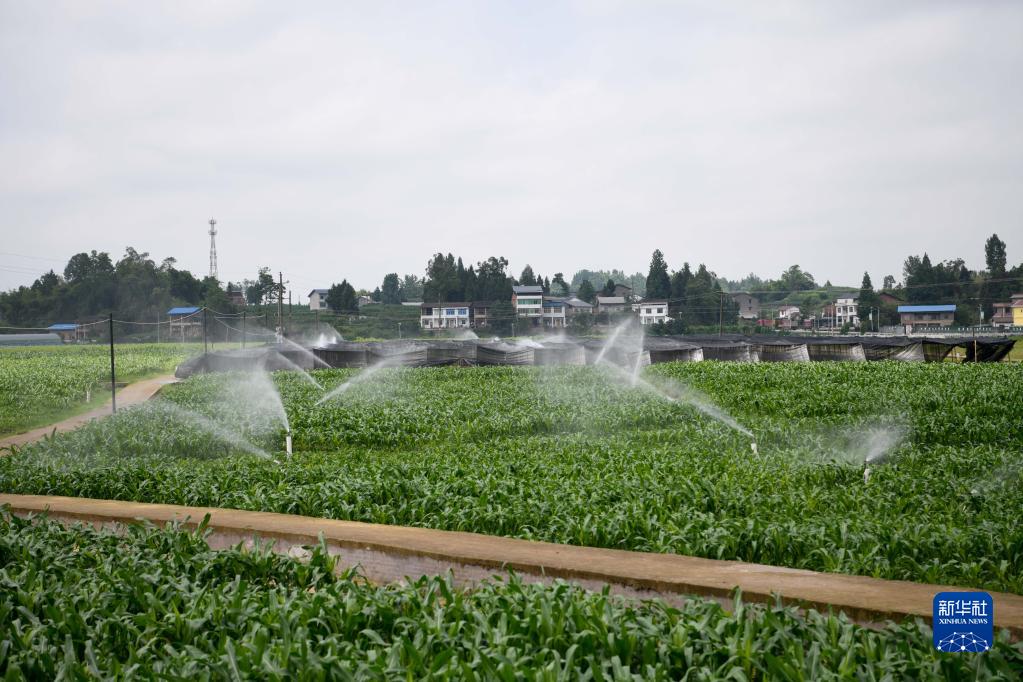 5月24日,在達州達川區萬家鎮一大豆玉米帶狀復合種植示范片,自動噴灌系統在澆水。