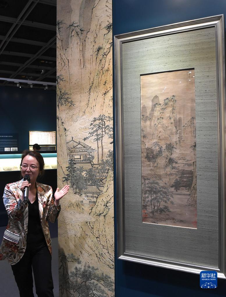 5月24日,在香港會議展覽中心,工作人員講解拍品明代畫家仇英的作品《仙山樓閣》。新華社記者 陳鐸 攝