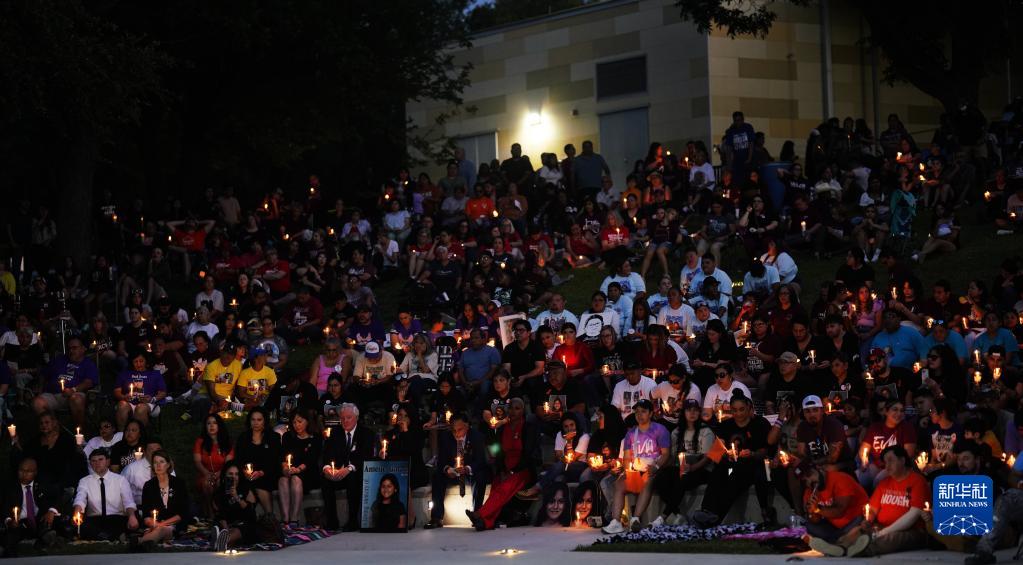 5月24日,在美國得克薩斯州小城尤瓦爾迪,人們參加守夜儀式悼念校園槍擊遇害者。