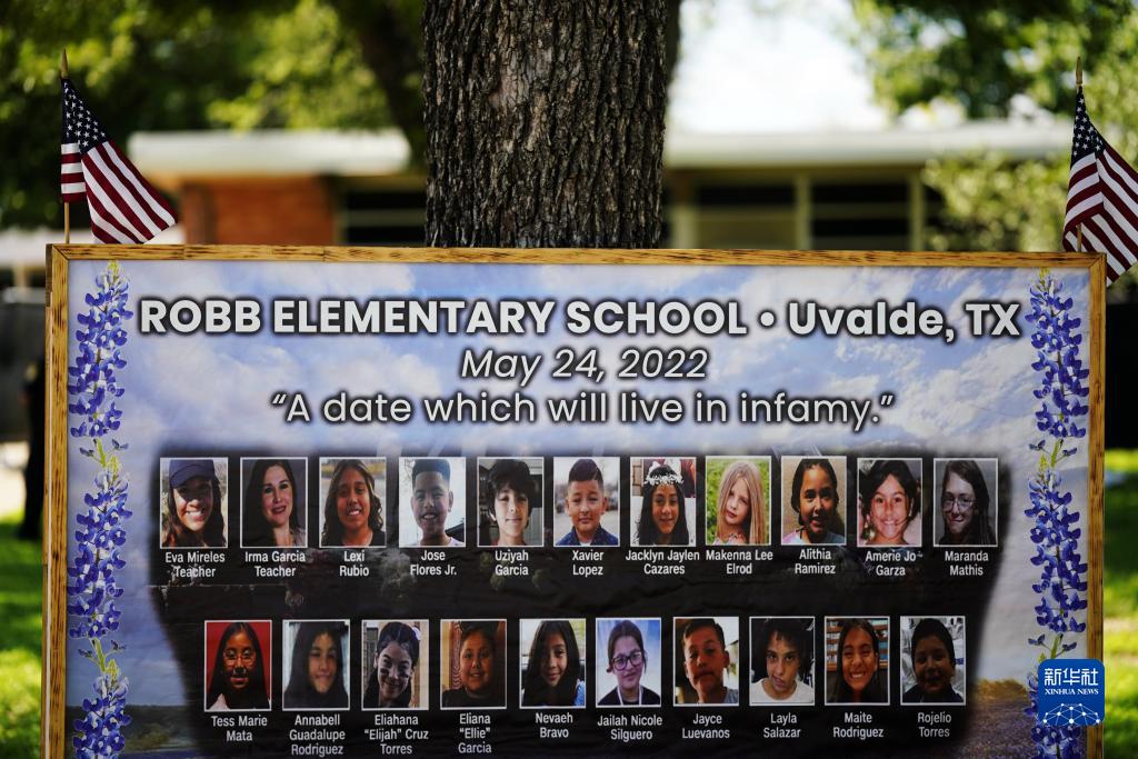 5月24日,美國得克薩斯州小城尤瓦爾迪的原羅布小學擺放著校園槍擊遇害者的照片。