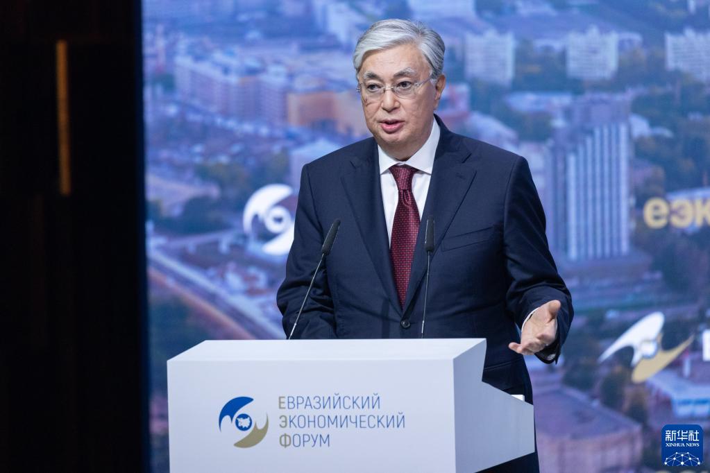 5月24日,在俄羅斯首都莫斯科,哈薩克斯坦總統托卡耶夫在論壇全會上致辭。