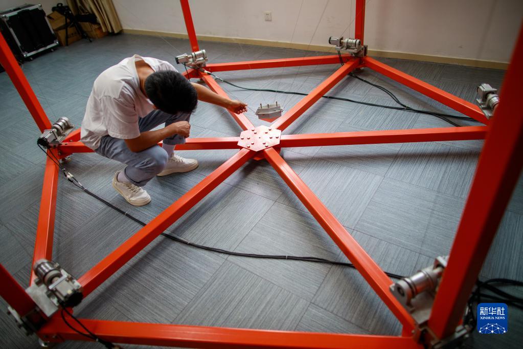 5月23日,工作人員在貴州大學省部共建公共大數據國家重點實驗室的“中國天眼”饋源艙模型前進行研究。