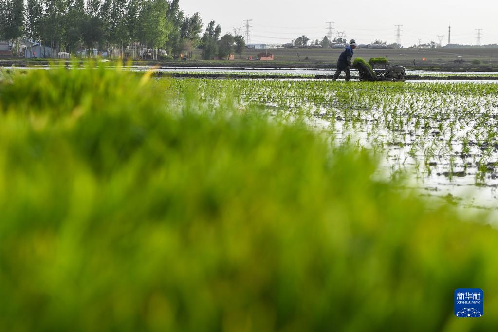 5月24日,農民在吉林省長春市九臺區龍嘉街道紅光村操作農機進行水稻插秧。