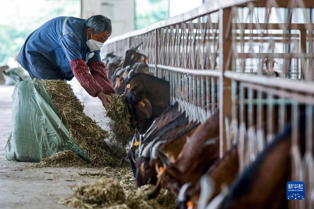 5月24日,在位于南江縣元潭鎮元泉村的南江黃羊筆架山一級擴繁場,工人在羊舍內給南江黃羊喂食。