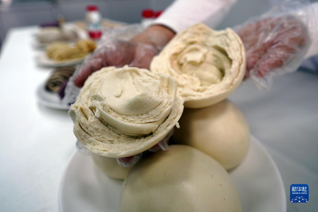 5月25日,在河北滄州渤海新區黃驊市一家農業科技公司產品展示廳,工作人員展示旱堿麥千層饅頭。