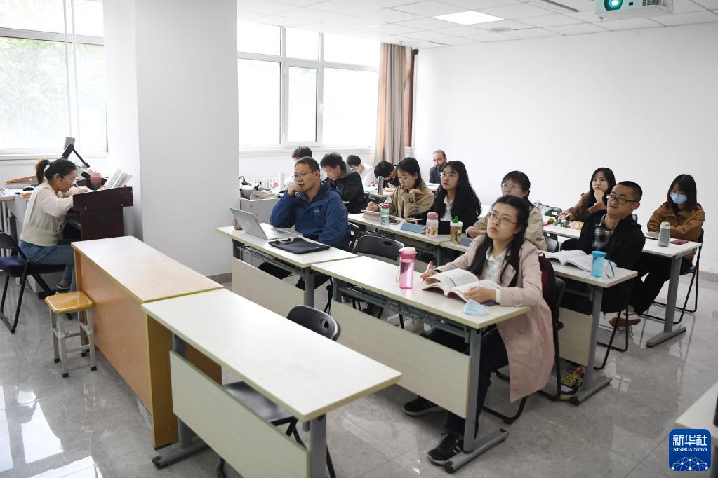 謝炎廷(右二)和同學在蘭州大學上課(5月10日攝)。