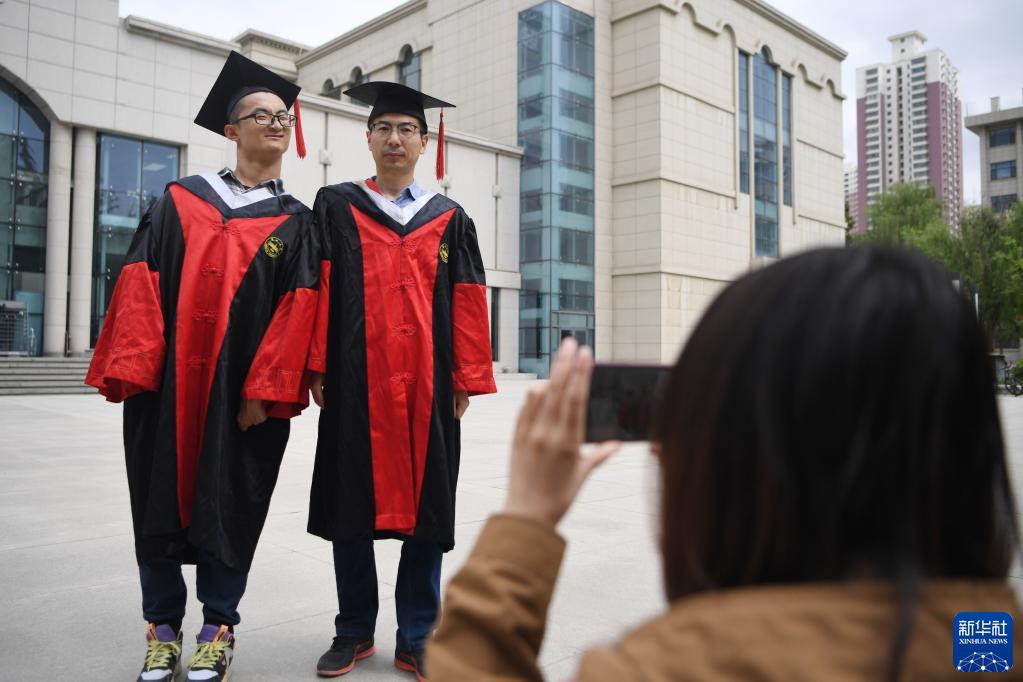 謝炎廷(左)和同學在校園里拍照留念(5月10攝)。新華社記者 陳斌 攝