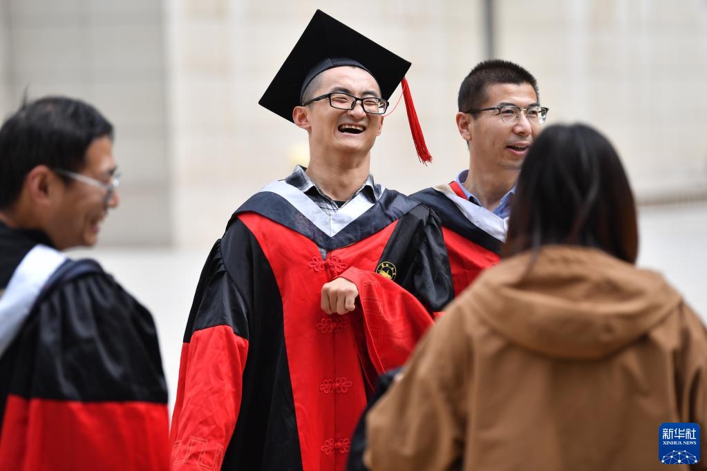 謝炎廷(左二)和同學在蘭州大學校園里交流(5月10攝)。新華社記者 陳斌 攝