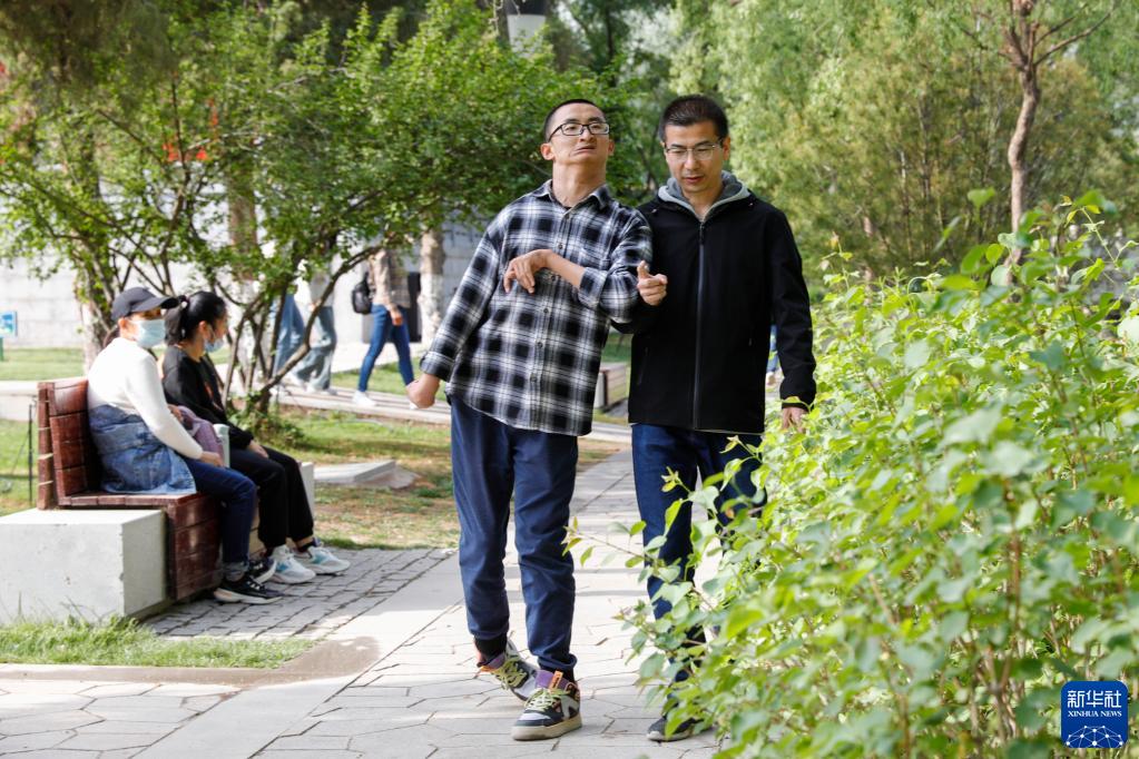 在蘭州大學,謝炎廷(右二)和同學在討論學業情況(5月12日攝)。新華社記者 方欣 攝