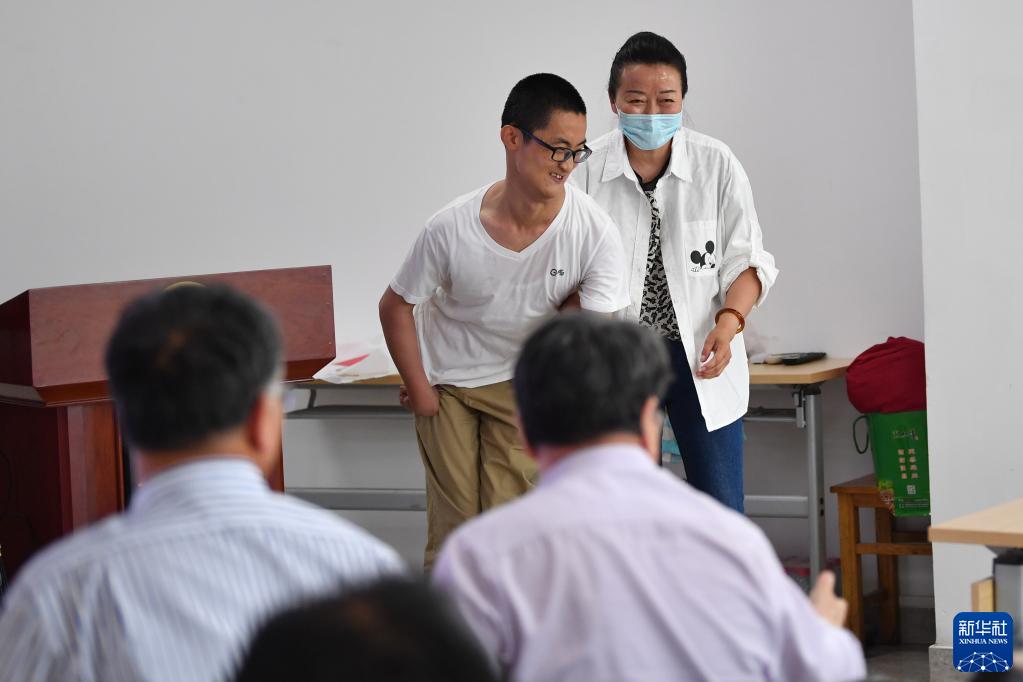 5月24日,完成論文答辯的謝炎廷和母親一起向老師同學們鞠躬致謝。新華社記者 陳斌 攝