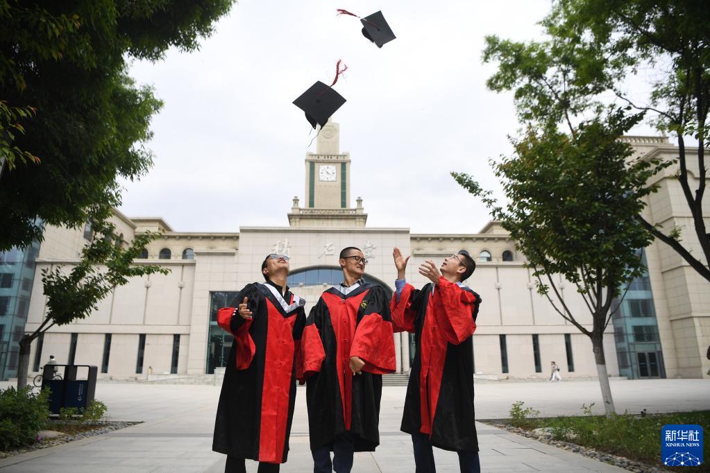 謝炎廷(中)和同學在蘭州大學圖書館前拍“畢業照”留念(5月10攝)。新華社記者 陳斌 攝