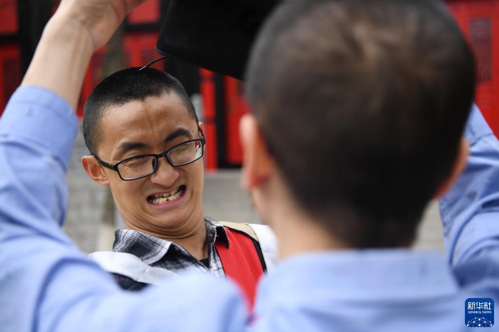 謝炎廷和同學在蘭州大學校園里準備拍“畢業照”留念(5月10攝)。新華社記者 陳斌 攝