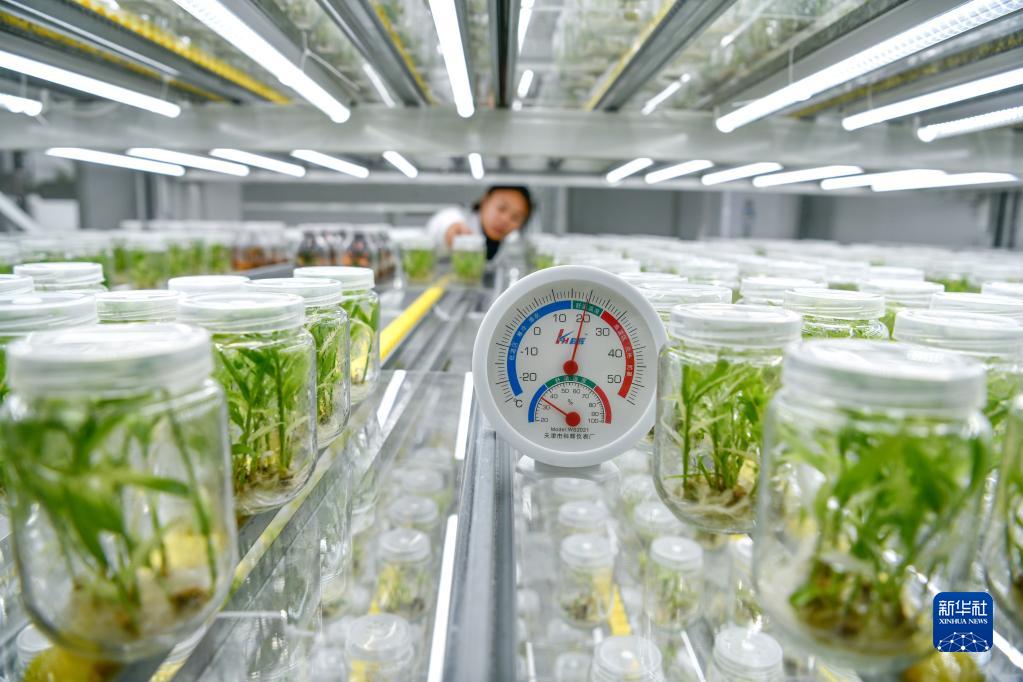 5月23日,工作人員在貴陽市開陽縣南江蔬菜良種繁育中心的組培中心查看小黃姜苗生長情況。