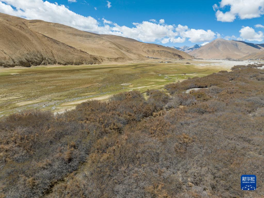 這是在珠峰國家級自然保護區內拍攝的沙棘林和濕地(5月25日攝,無人機照片)。