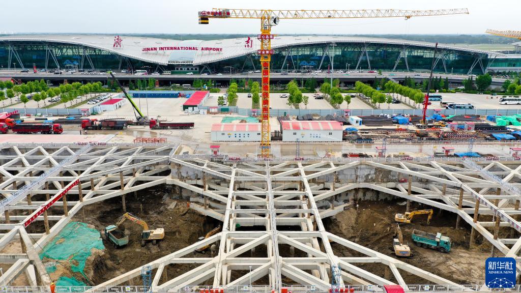 5月25日拍攝的濟南遙墻機場綜合交通樞紐工程施工現場。