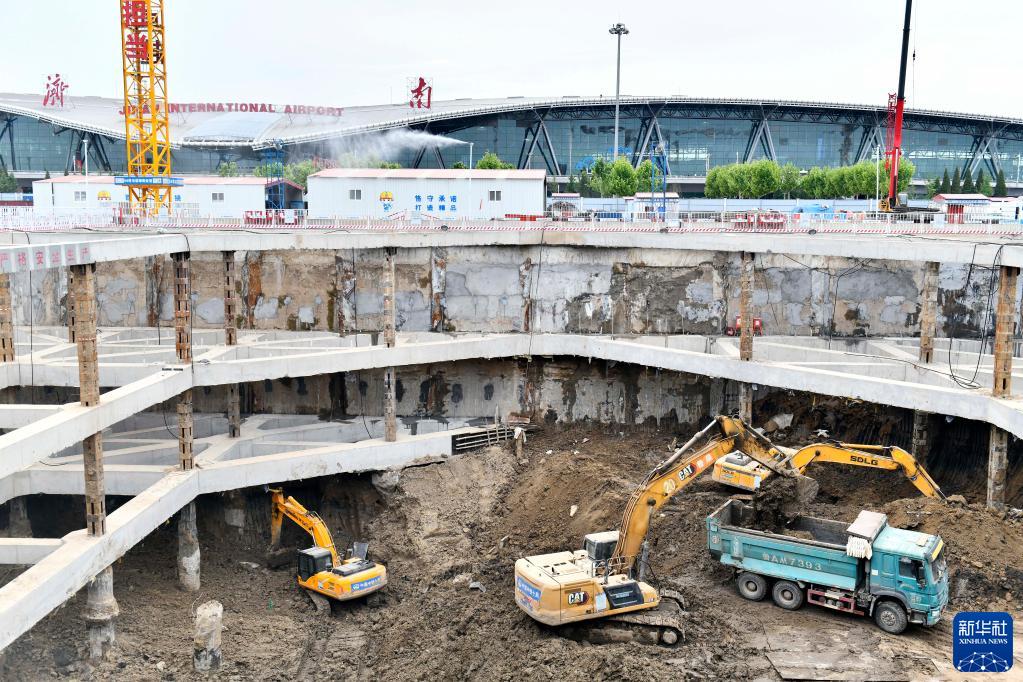 5月25日,施工人員在濟南遙墻機場綜合交通樞紐工程施工現場挖掘地鐵車站基坑。