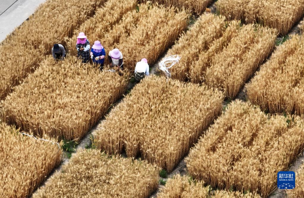 5月25日,在江蘇里下河地區農科所(揚州市農科院),農民在試驗田管護小麥(無人機照片)。