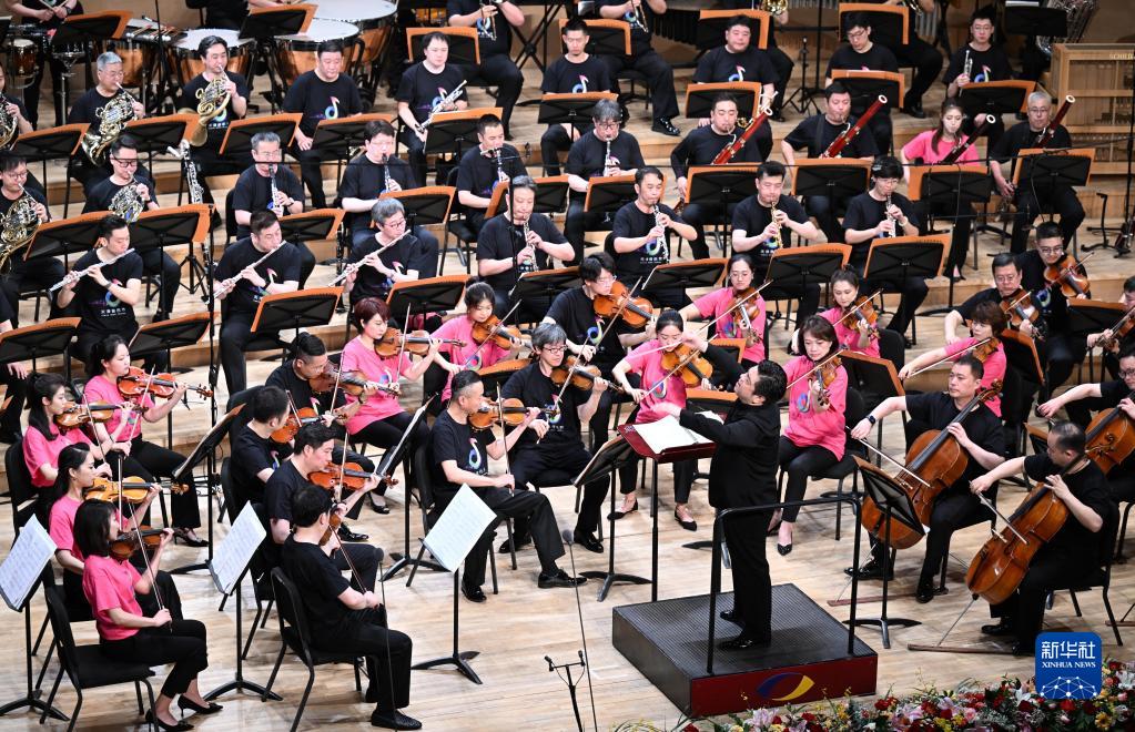 5月25日,在天津大劇院音樂廳,由天津歌舞劇院、天津交響樂團等組成的天津百人聯合樂團在舞臺上演奏。