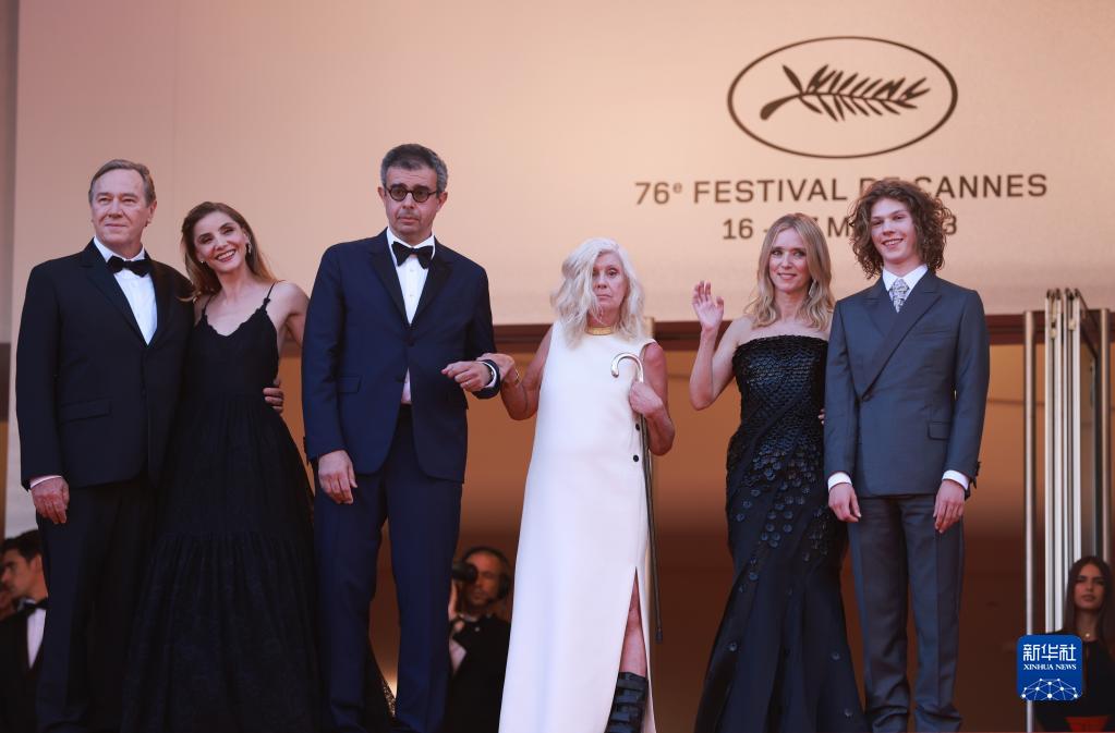5月25日,在法國戛納舉行的第76屆戛納國際電影節上,法國導演凱瑟琳·布雷亞(右三)攜主創踏上影片《去年夏天》首映禮紅毯。