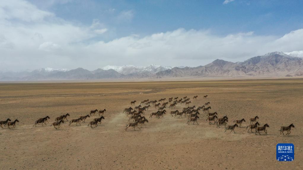 一群藏野驢在阿爾金山國家級自然保護區奔跑(5月23日攝,無人機照片)。
