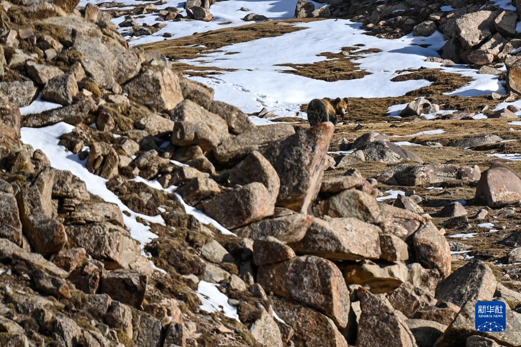 一頭藏馬熊在阿爾金山國家級自然保護區覓食(5月23日攝)。