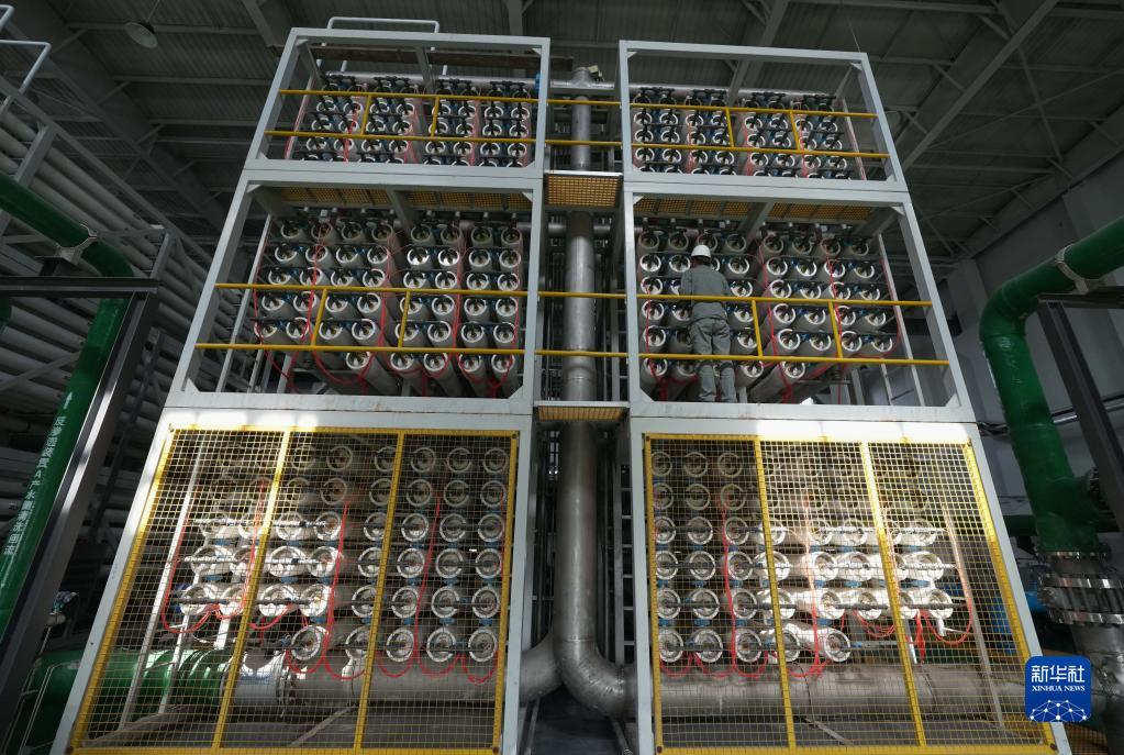 5月25日,工人在唐山市海港經濟開發區海水淡化項目投產的淡水生產車間工作。
