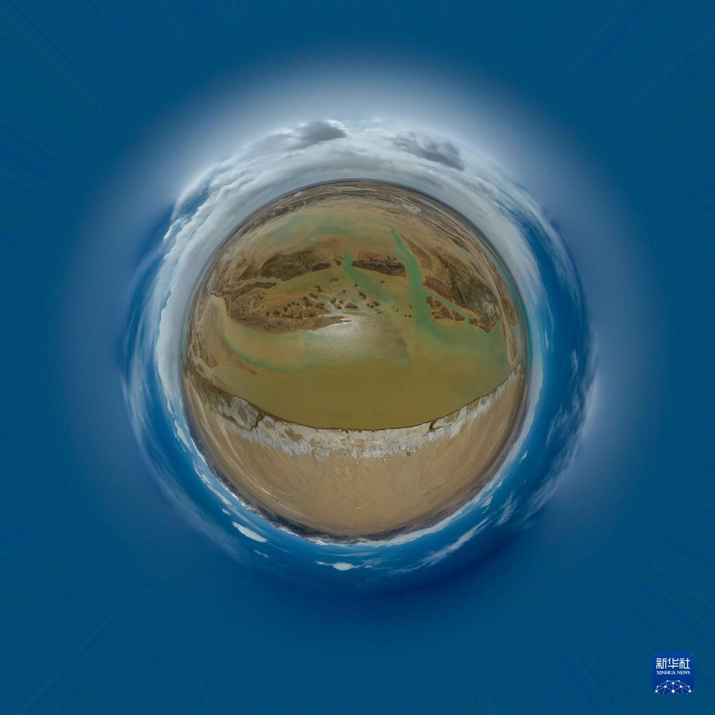 這是5月23日在新疆東昆侖庫木庫里盆地拍攝的阿雅克庫木湖河流入湖口(無人機球形全景照片)。