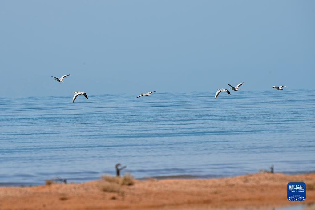 一群斑頭雁在位于新疆東昆侖庫木庫里盆地的阿雅克庫木湖上空飛翔(5月23日攝)。