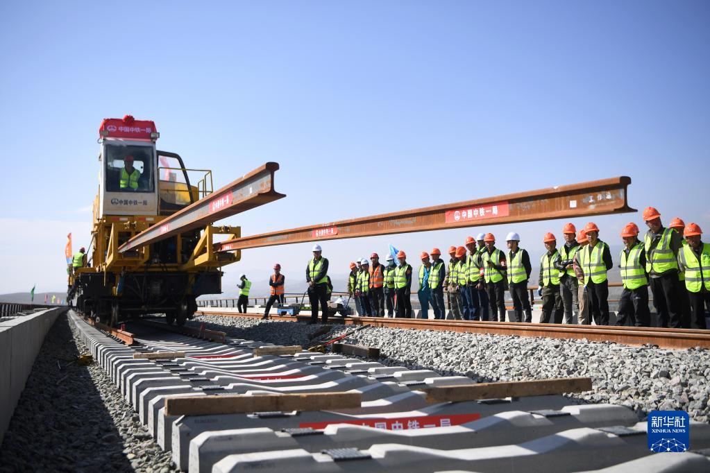 當日,在甘肅省武威市天祝藏族自治縣境內蘭(蘭州)張(張掖)三四線鐵路鋪軌施工現場,一體式牽引車在中鐵一局施工人員的操作下,將一組500米長的鋼軌精準鋪設在道床上,標志著由中鐵一局承建的蘭張三四線鐵路蘭州至武威段進入全線鋪軌階段。