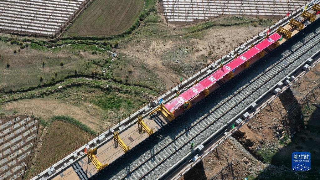 這是5月26日拍攝的中鐵一局蘭張三四線鐵路下河東特大橋鋪軌作業現場(無人機照片)。
