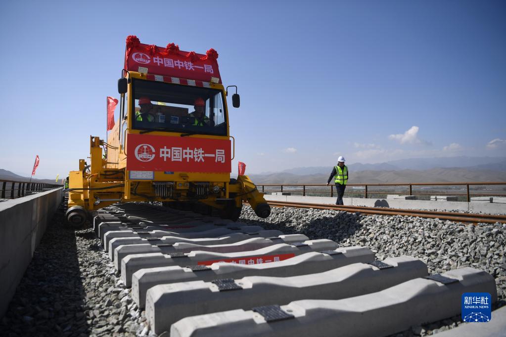 當日,在甘肅省武威市天祝藏族自治縣境內蘭(蘭州)張(張掖)三四線鐵路鋪軌施工現場,一體式牽引車在中鐵一局施工人員的操作下,將一組500米長的鋼軌精準鋪設在道床上,標志著由中鐵一局承建的蘭張三四線鐵路蘭州至武威段進入全線鋪軌階段。