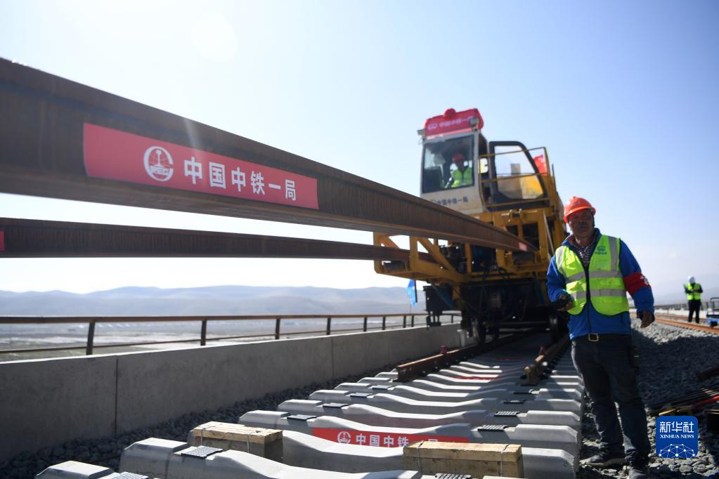 當日,在甘肅省武威市天祝藏族自治縣境內蘭(蘭州)張(張掖)三四線鐵路鋪軌施工現場,一體式牽引車在中鐵一局施工人員的操作下,將一組500米長的鋼軌精準鋪設在道床上,標志著由中鐵一局承建的蘭張三四線鐵路蘭州至武威段進入全線鋪軌階段。