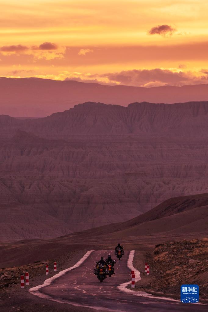 夕陽時分,三位騎士駕駛摩托車駛向札達土林(5月25日攝)。