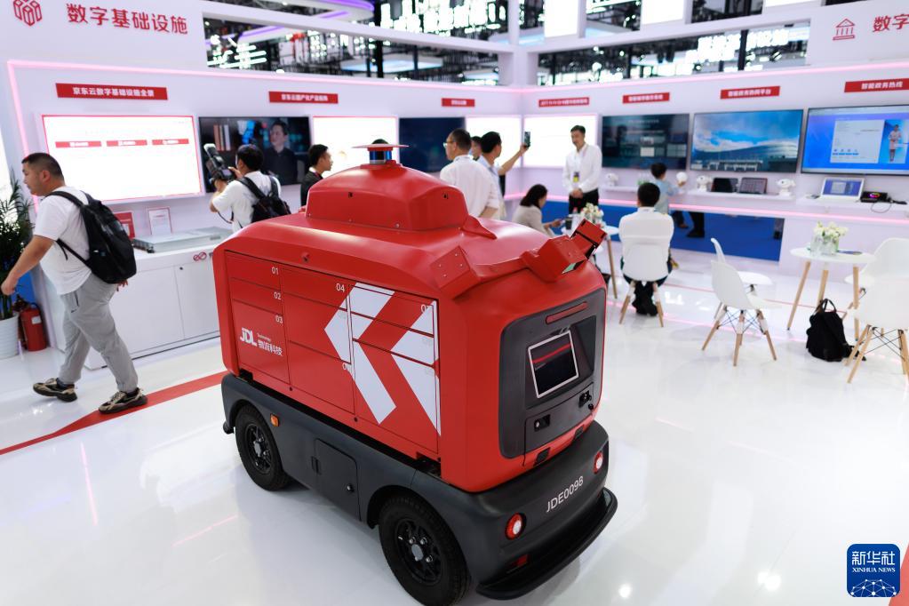 5月26日,觀眾在數博會現場參觀物流智能快遞車。