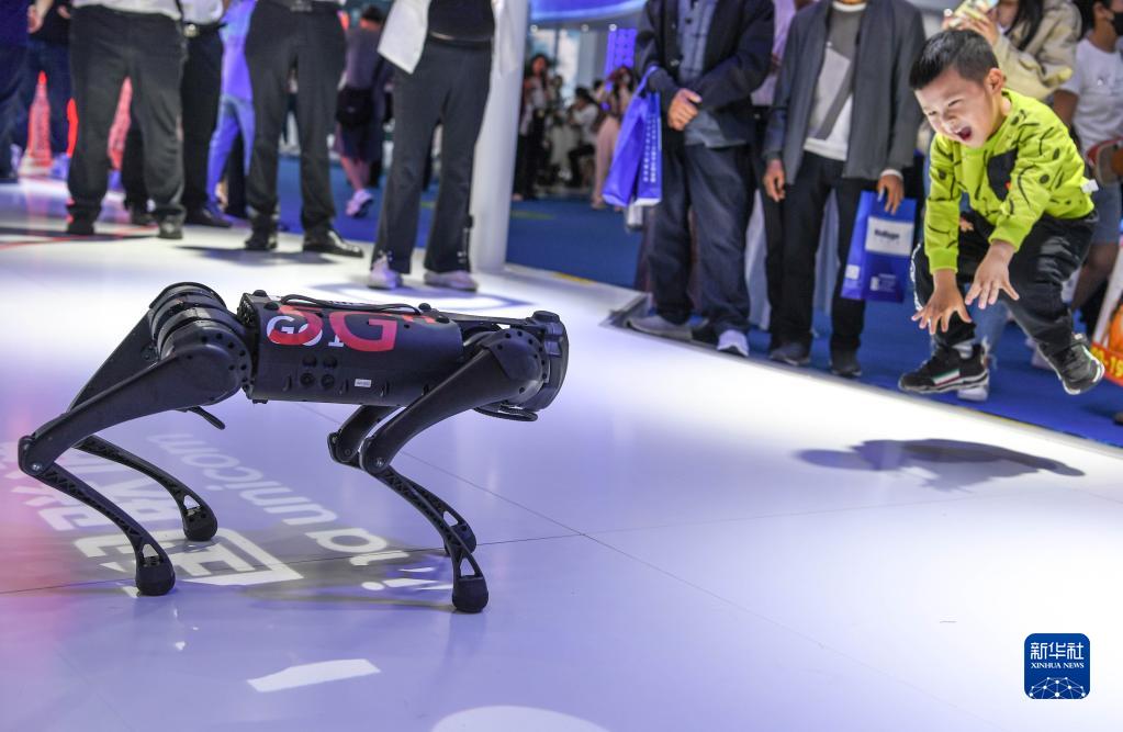 5月26日,小朋友在數博會展館內與一款智能機器狗互動。